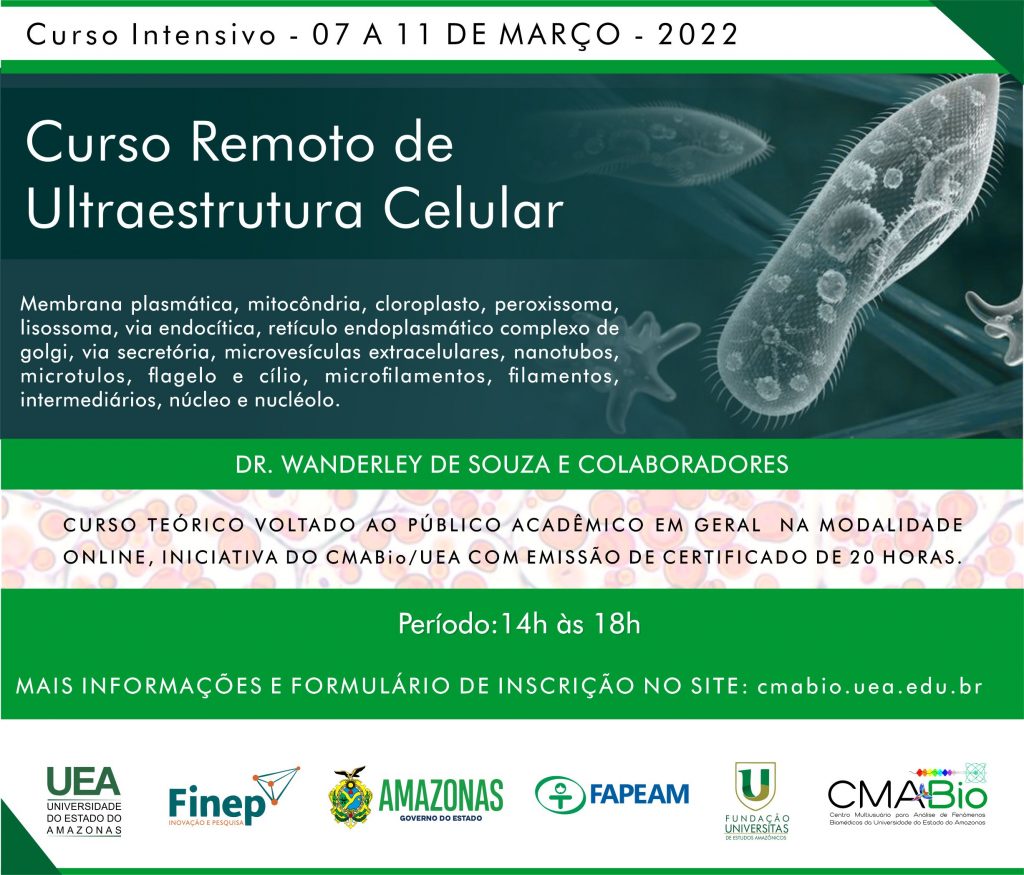 Entre os dias 7 e 11 de março de 2022, de 14 às 18 horas, o CMABio ofereceu um curso teórico, gratuito e totalmente online sobre ultraestrutura celular. O curso, com certificação de 20 horas, será voltado tanto para pesquisadores e pós-graduandos que já realizaram cursos prévios no CMABio, bem como para novos interessados.